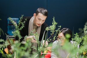 每一個花藝作品,其實(shí)都蘊(yùn)藏著嚴(yán)謹(jǐn)?shù)墓に?,比如綠枝根莖部分的尺寸比例,花與綠枝之間的空間關(guān)系,老師都細(xì)致地進(jìn)行了講解。修剪非常有講究,去掉多余的葉子,控制更好地視覺高度,也是整個花藝作品呈現(xiàn)品質(zhì)的關(guān)鍵。